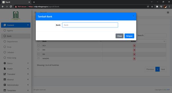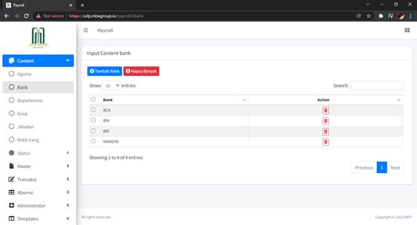 Sub Menu Content Bank digunakan untuk menambahkan, mengubah, dan menghapus data/informasi bank apa saja yang digunakan oleh pengguna sebagai tujuan pembayaran payrollnya.