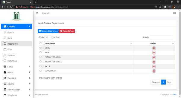 Sub Menu Content Departemen digunakan untuk menambahkan, mengubah, dan menghapus data/informasi Departemen apa saja yang terdapat dalam organisasi.
