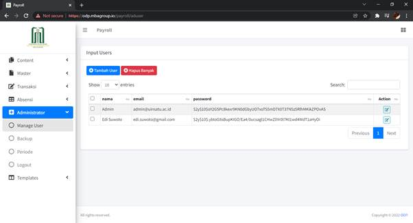 Sub Menu Manage User digunakan untuk menentukan pengguna yang berhak menggunakan sistem ini (Hak Akses).
