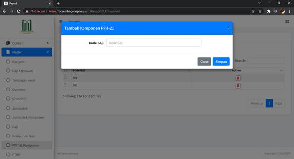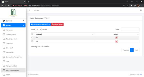 Sub Menu Master PPH 21 Komponen digunakan untuk menambahkan, mengubah, dan menghapus data/informasi PPH 21 Komponen yang dipotong dari gaji pegawai dalam organisasi.