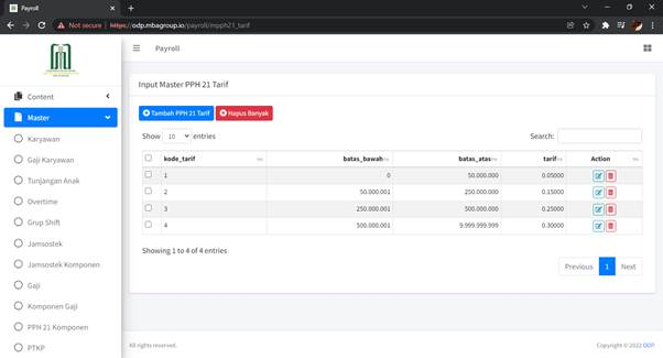 Sub Menu Master PPH 21 Tarif digunakan untuk menambahkan, mengubah, dan menghapus data/informasi besaran potongan PPH 21 sesuai dengan besaran penghasilan yang tidak kena pajak.
