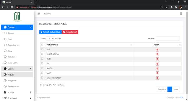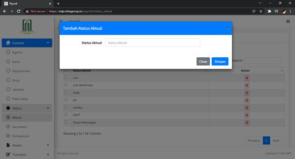 Sub Menu Content Status Aktual digunakan untuk menambahkan, mengubah, dan menghapus data/informasi Status Aktual seorang pegawai dalam lingkungan organisasi yang dapat mempengaruhi nilai payroll yang diterima.