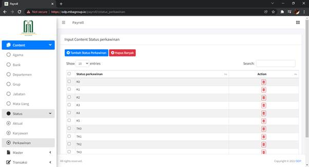 Sub Menu Content Status Perkawinan digunakan untuk menambahkan, mengubah, dan menghapus data/informasi Status Perkawinan seorang pegawai dalam lingkungan organisasi yang dapat mempengaruhi nilai payroll yang diterima.