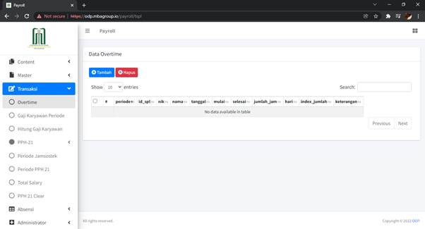 Menu Transaksi Payroll digunakan oleh manajemen untuk memasukkan data/informasi transaksi yang terkait dengan besaran payroll yang diterima oleh seorang pegawai per periode waktu tertentu dalam lingkungan organisasi dengan sebagai berikut: